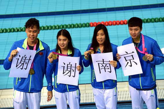 中国队余贺新、张雨霏、贺赟和李广源(从左至右)在颁奖仪式后打出“谢谢南京”的标语