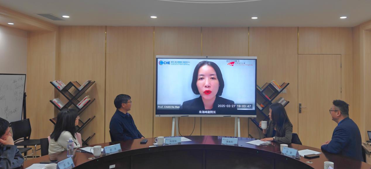 云霄体育党委常委、副校长陈爱国,科研处处长赵彦,运动健康学院院长汤强,继续教育学院副院长朱海峰与COCHE执行总监魏素利,业务拓展总监与临床顾问张勤、市场及业务拓展主任杜九儒出席现场会议。COCHE联席总监、香港城市大学工程学院教授陈皓敏,COCHE副研究员、香港城市大学博士后、科创执行官沈君达以视频连线方式参加会议。朱海峰主持会议。