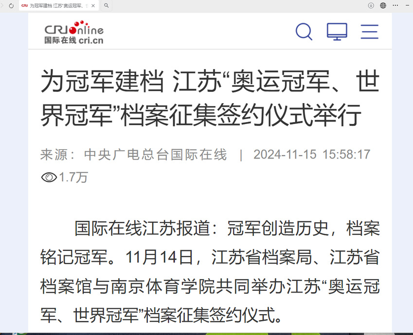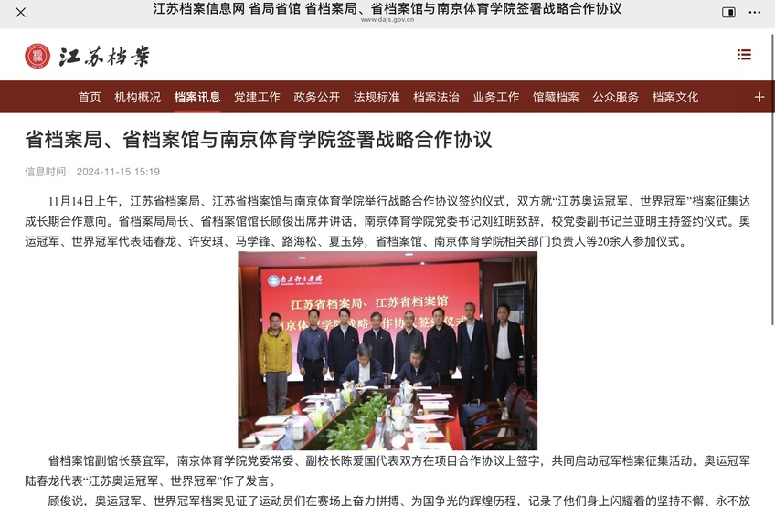 【中央广电总台国际在线】为冠军建档 江苏“奥运冠军、世界冠军”档案征集签约仪式举行