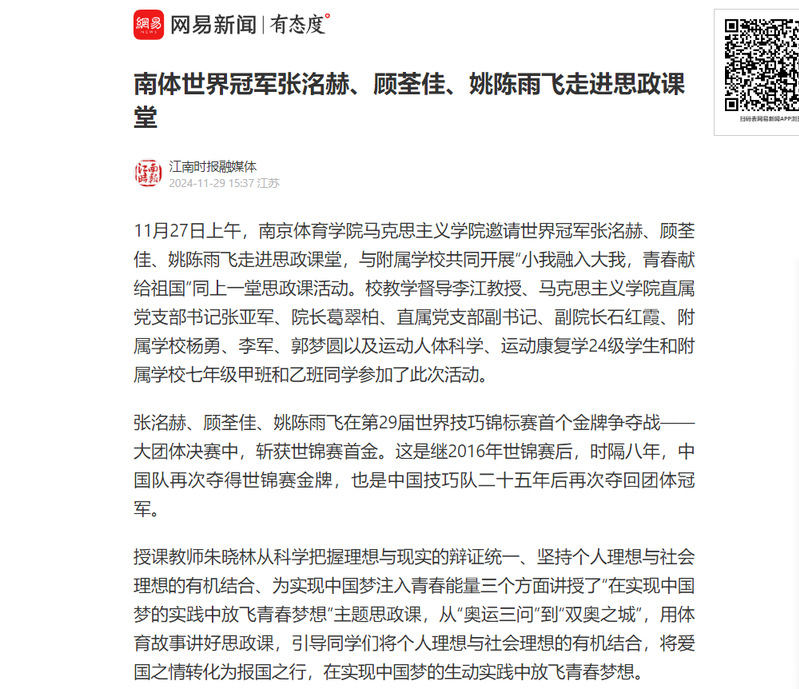 【网易新闻】南体世界冠军张洺赫、顾荃佳、姚陈雨飞走进思政课堂