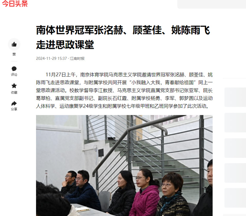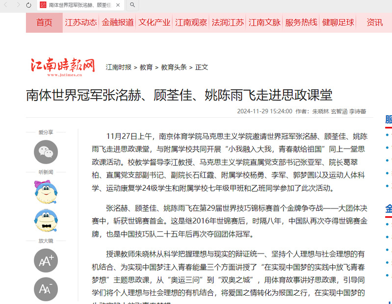 【江南时报】南体世界冠军张洺赫、顾荃佳、姚陈雨飞走进思政课堂