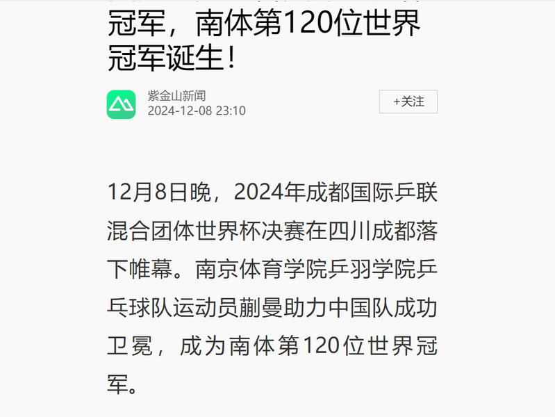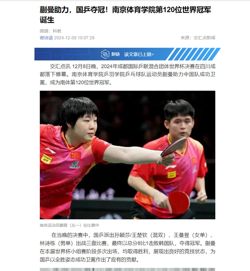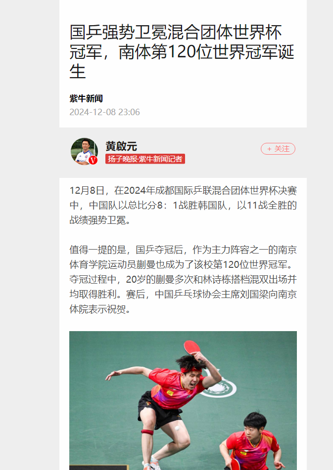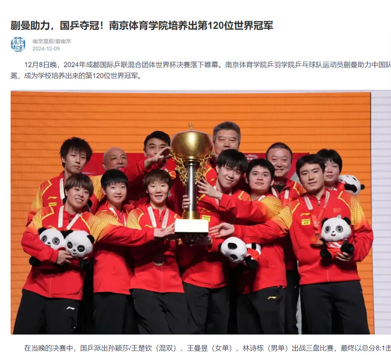 【紫金山新闻】国乒卫冕混合团体世界杯冠军,南体第120位世界冠军诞生!