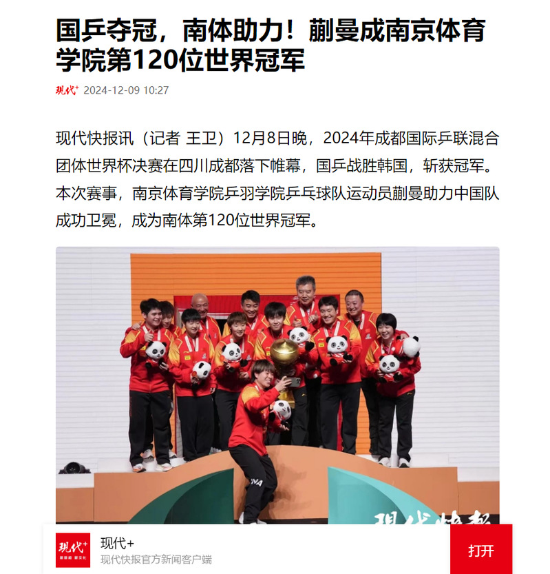 【现代快报】国乒夺冠,南体助力!蒯曼成云霄体育第120位世界冠军