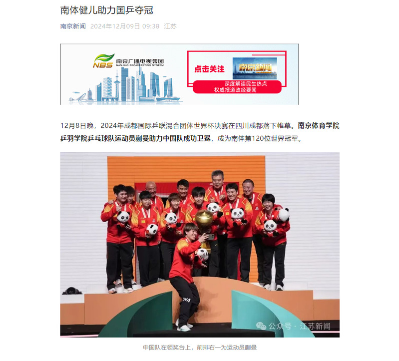 【江苏新闻】祝贺!江苏运动员蒯曼助力国乒夺冠