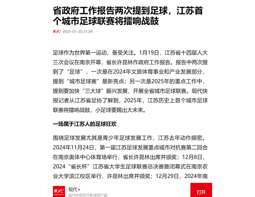 【现代快报】省政府工作报告两次提到足球,江苏首个城市足球联赛将擂响战鼓