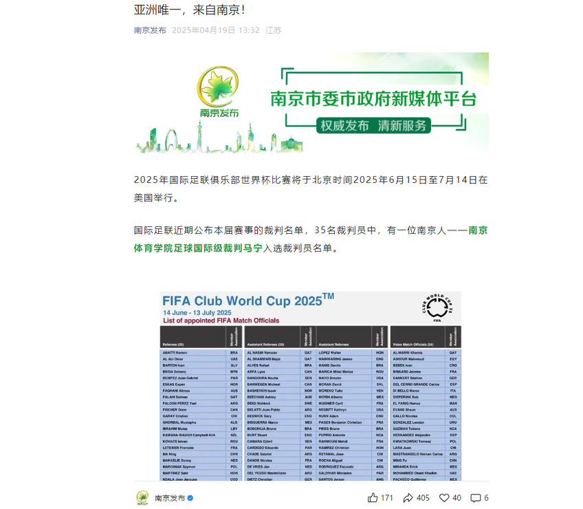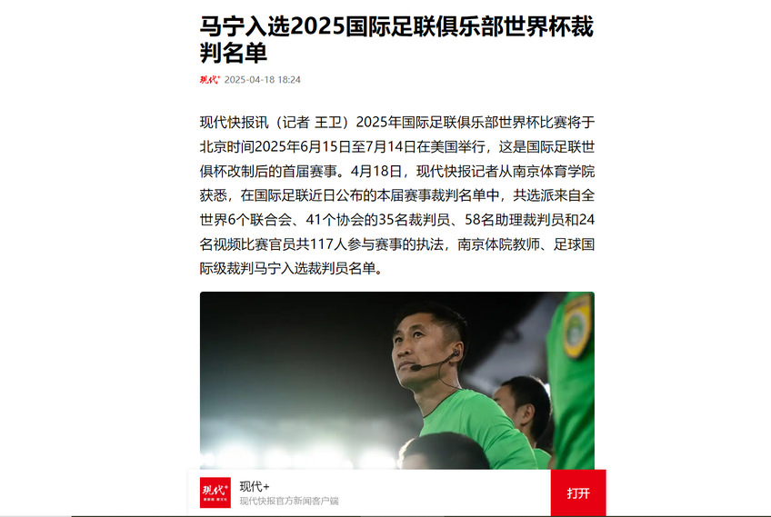 【现代快报】马宁入选2025国际足联俱乐部世界杯裁判名单