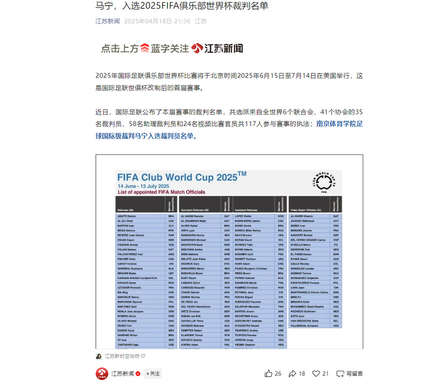 【江苏新闻】马宁,入选2025FIFA俱乐部世界杯裁判名单