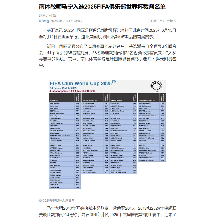 【交汇点新闻】南体教师马宁入选2025FIFA俱乐部世界杯裁判名单