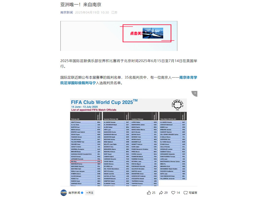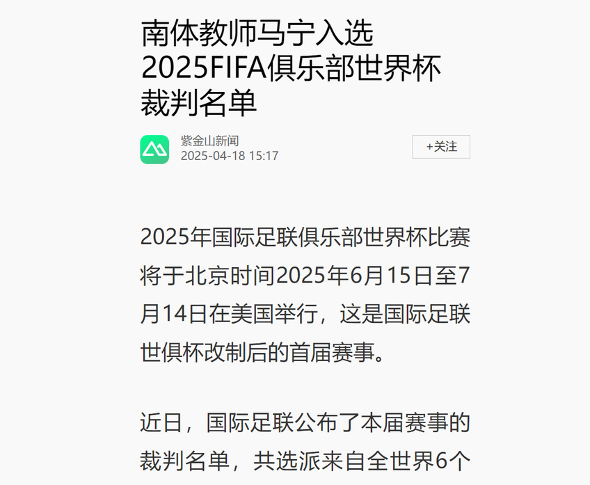 【紫金山新闻】南体教师马宁入选2025FIFA俱乐部世界杯裁判名单