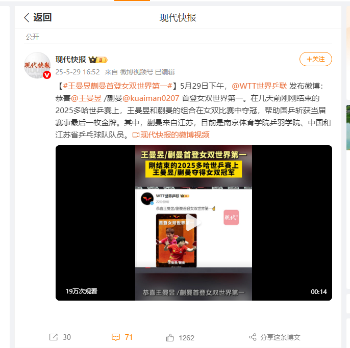 【现代快报】王曼昱蒯曼首登女双世界第一