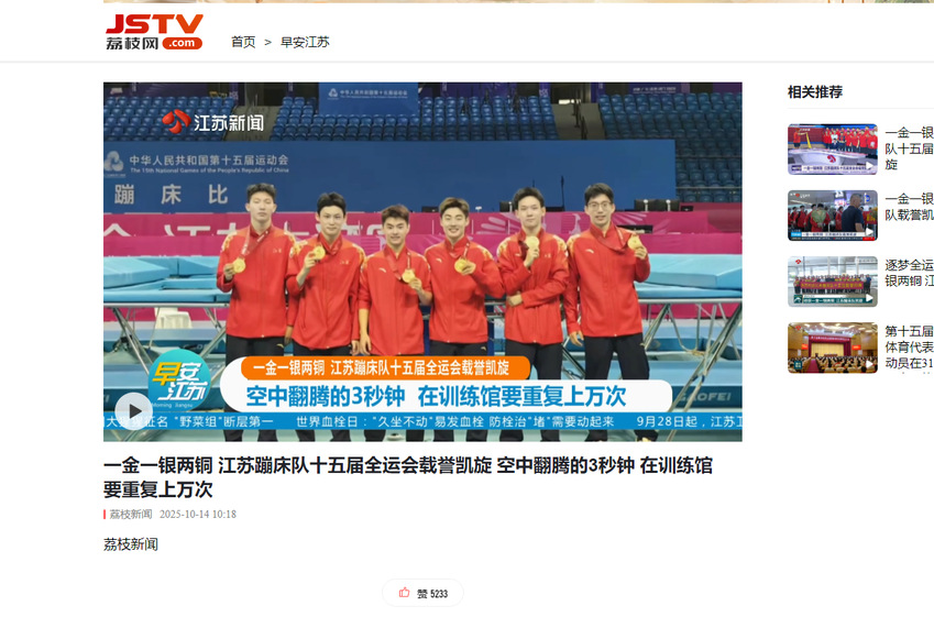 【荔枝新闻】一金一银两铜 江苏蹦床队十五届全运会载誉凯旋