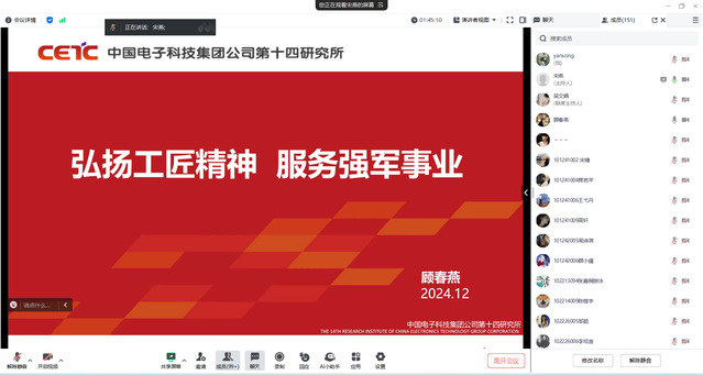 劳动谱写时代华章,奋斗创造美好未来。为深入学习党的二十大和二十届二中、三中全会指示精神,贯彻习近平总书记关于大力弘扬劳模精神、劳动精神、工匠精神的重要指示,12月27日晚,我校在线上举办“劳模大讲堂·大国工匠进校园”活动。本次活动邀请大国工匠宣传人物、省五一劳动奖章获得者,中国电科第十四研究所雷达微电路总装师顾春燕,作《弘扬工匠精神 服务强军事业》专题讲座。全校150余名本科生参加了此次活动。