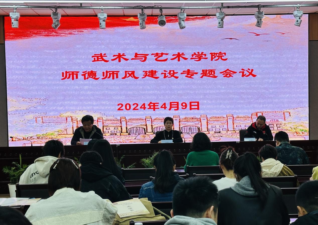 为巩固拓展学习贯彻习近平新时代中国特色社会主义思想主题教育成果,推动师德师风建设走深走实,4月9日,武术与艺术学院在校工会多功能厅召开专题会议。党总支书记叶瑛、副书记杜家俊、副院长唐芒果出席,全体教师参加会议。会议由杜家俊主持。