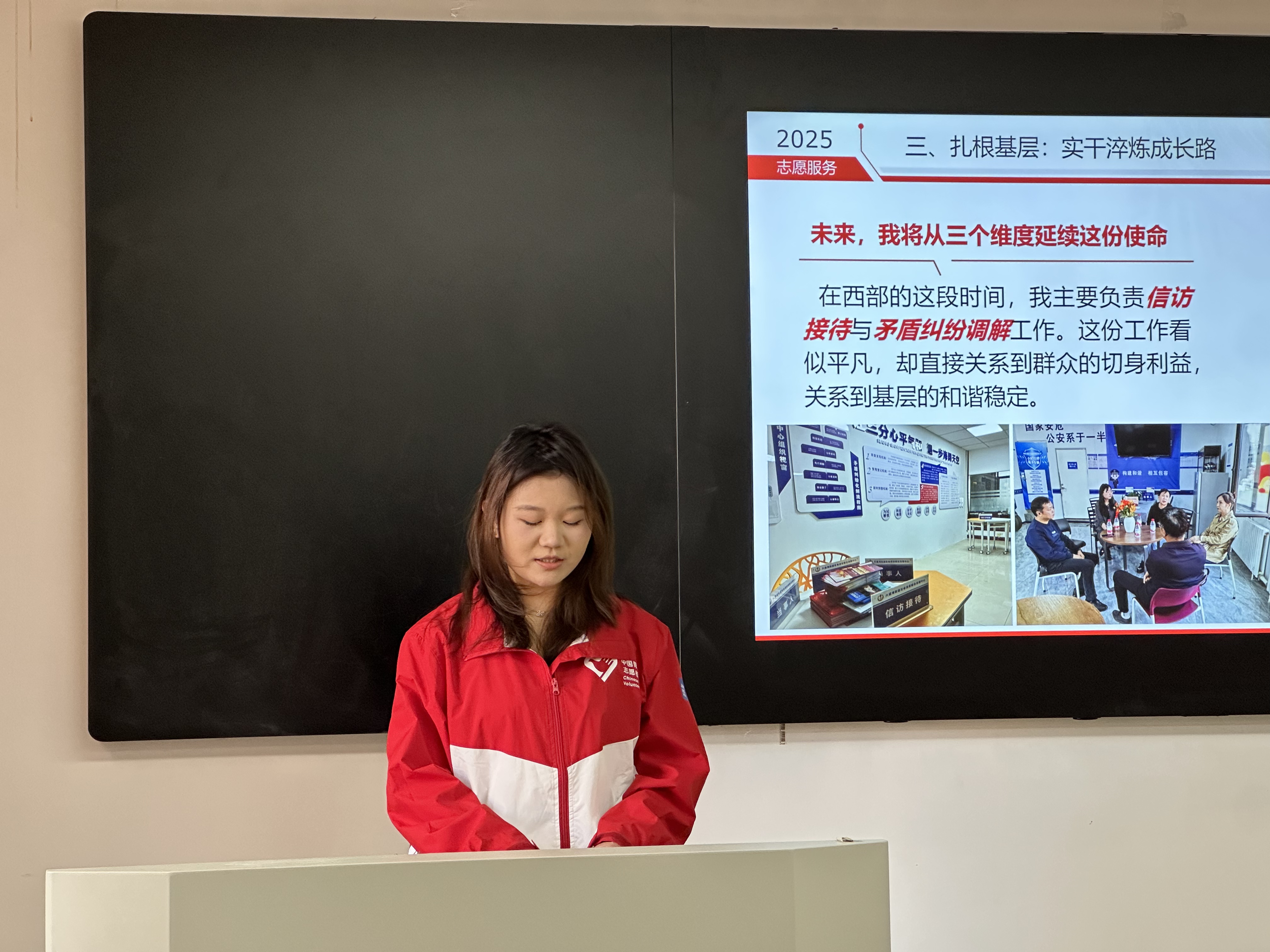 苏州大学志愿者白洋则以“你的青春 将如何下笔”引发在场同学思考。他在新疆基层从事青年工作时,通过策划“青春宣讲团”“乡村文艺课堂”等项目,将专业知识转化为服务边疆的实际行动。他坦言,西部的工作虽充满挑战,却也孕育着成长的惊喜——从协助举办活动到参与乡村振兴文化宣传,在“祖国最需要的地方”,以青春为笔、奉献为墨,绘制出属于新时代青年的最美篇章。
