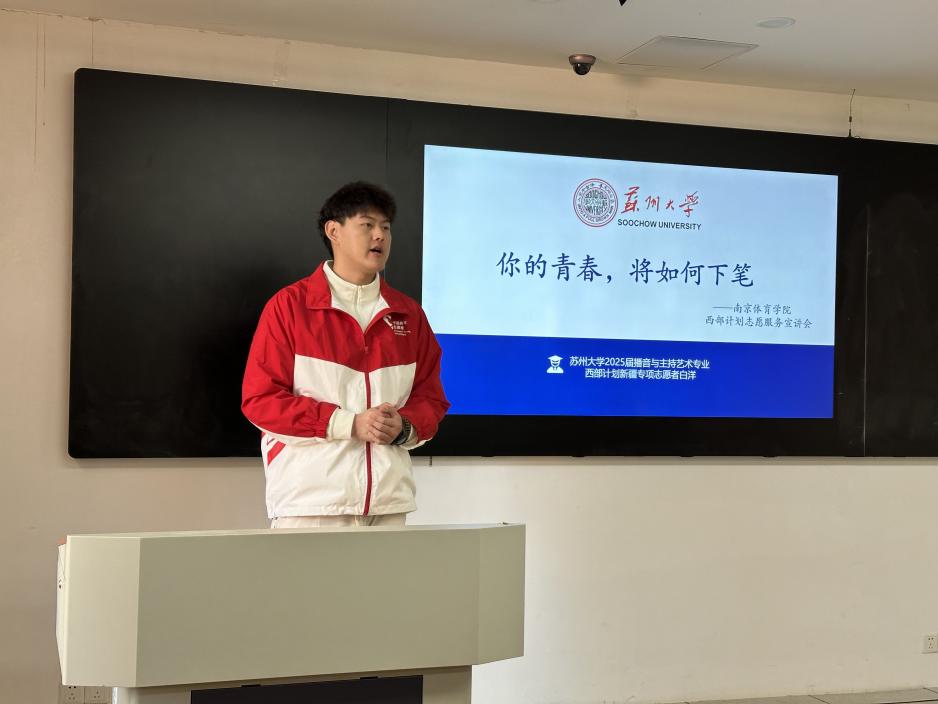 12月1日上午,武术与艺术学院在图书馆第二报告厅举行西部计划新疆专项宣讲会。本次宣讲由云霄体育武术与艺术学院2025届毕业生、西部计划志愿者刘亦麟和苏州大学西部计划志愿者白洋担任主讲,分别以“西部 我的无限可能”“你的青春 将如何下笔”为题分享他们在西部的故事。第十二期青马班全体学员及毕业班有意向申报西部计划的同学共同参与了这场关于青春与奉献的心灵之约。