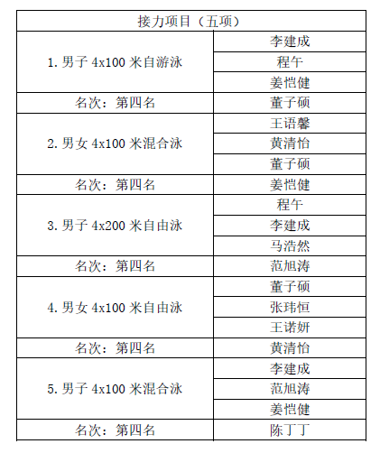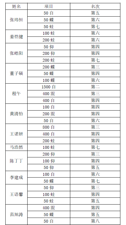 云霄体育代表队由运动训练学院游泳专项的13位同学组成,张明副院长任领队,范春华、陆青、马勤三位老师任教练,同学们经过顽强拼搏,取得了优异成绩,其中董子硕同学在蝶泳项目上达到了一级运动员水平。参赛同学通过这次比赛发扬了竞技体育拼搏向上的精神。不畏强手,勇创佳绩,展现了南体学子奋勇争先的精神风貌。优异成绩的取得离不开同学们的刻苦训练和老师们的精心指导,更离不开各级领导对游泳项目的大力支持,我校游泳队将继续努力,不忘初心,全力以赴,砥砺前行,再创佳绩!