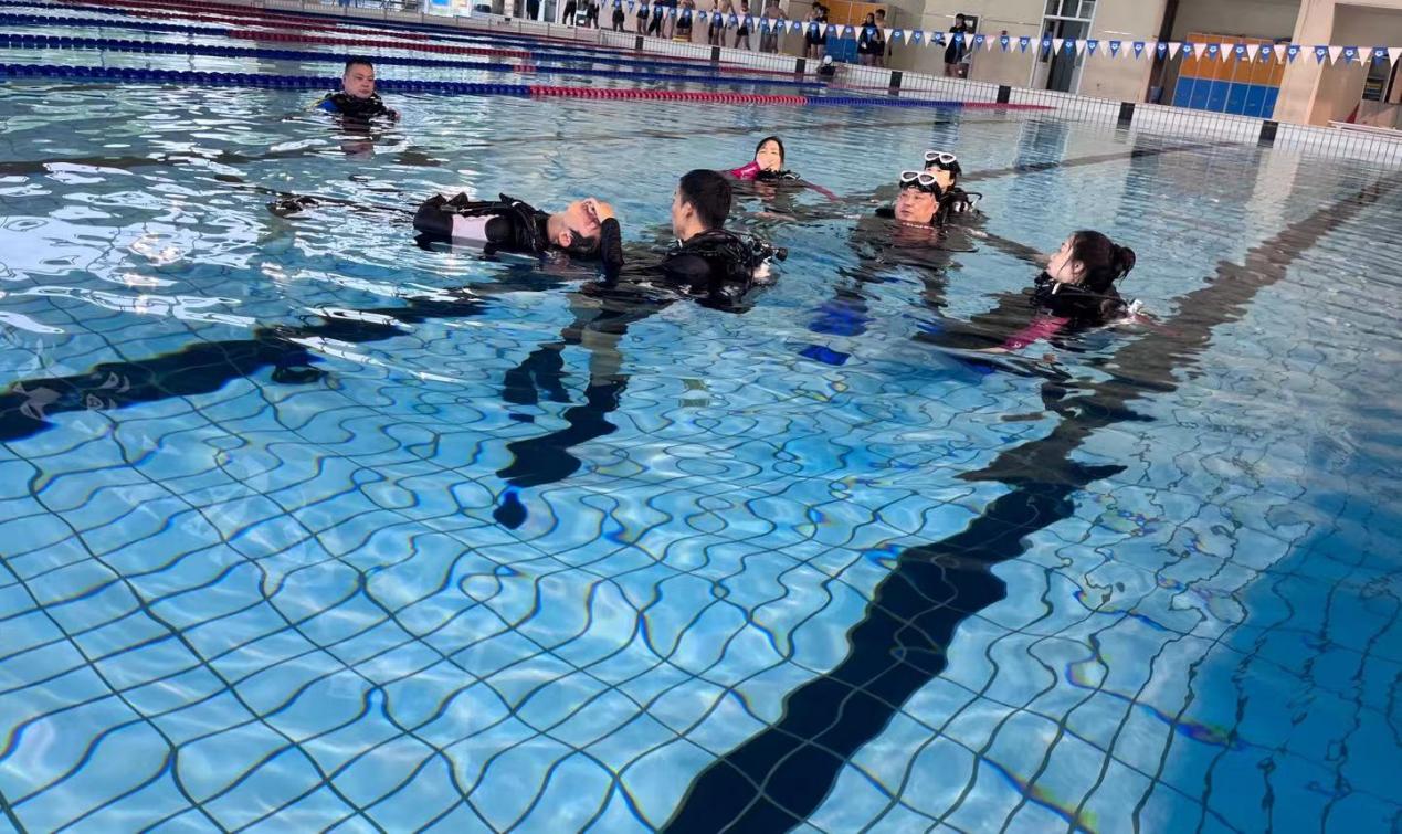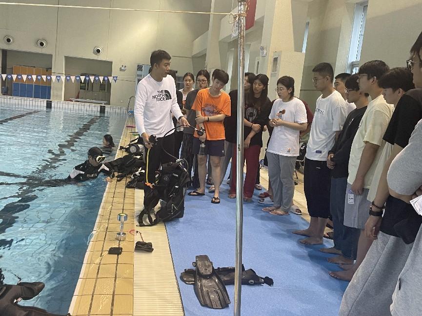 游泳馆的水上课观摩则更加生动有趣,吴元杰老师亲自示范蹼泳的动作和技巧,并对潜水实际操作中可能遇到的重、难点问题作了阐释,对突发情况的处理流程、应急状态下的安全反应进行了重点讲解;在最后的互动环节,吴元杰老师对同学们提出的问题一一作答,并期待着更多的游泳爱好者加入到蹼泳的行列中来,共同推动蹼泳项目的发展。
