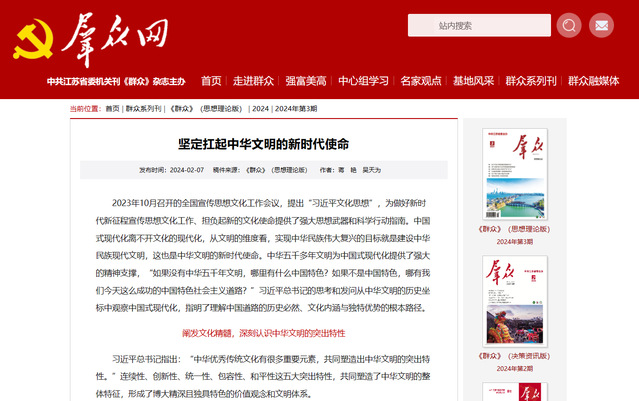 近日,马克思主义学院蒋艳教授在中共江苏省委机关刊《群众》(思想理论版)发表理论性研究文章《坚定扛起中华文明的新时代使命》,成为马克思主义学院学习习近平文化思想的又一阶段性成果。蒋艳教授从“阐发文化精髓,深刻认识中华文明的突出特性”“赓续中华文脉,推动中华优秀传统文化‘两创’”“开放包容,建设中华民族现代文明”三个方面系统阐释了习近平文化思想的丰富内涵与时代价值。