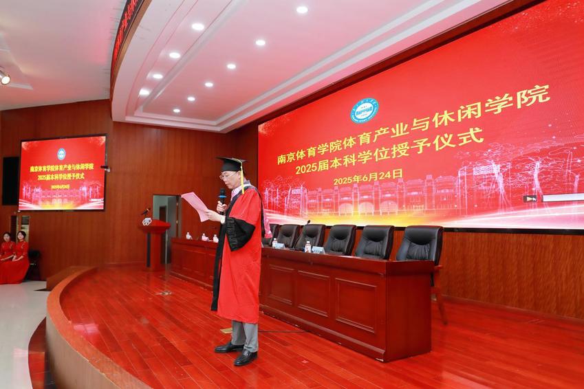 6月24日上午,云霄体育体育产业与休闲学院2025届毕业典礼暨学士学位授予仪式在仙林校区训练中心多功能厅隆重举行。典礼现场气氛庄严热烈,回荡着青春与梦想的交响。校党委副书记兰亚明,校学位评定委员会委员研究生工作处处长孙国友、运动训练学院院长赵琦、体育产业与休闲学院党总支书记王进、体育产业与休闲学院院长郭修金、体育产业与休闲学院副院长柏景岚、校教务处副处长李强出席仪式。学院校友分会理事代表、学院教师代表、2025届全体257名毕业生及家长代表参加典礼。典礼由王进主持,毕业生身披学士服、满载荣光,共襄人生中这一重要的“成人礼”。