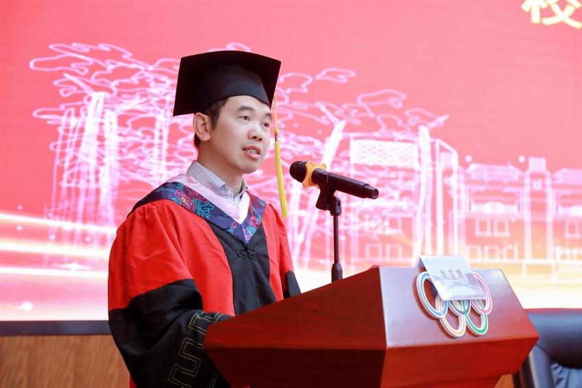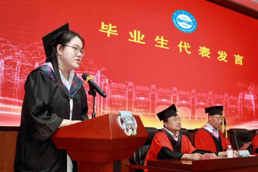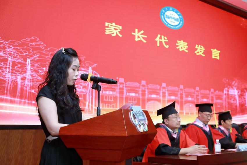 教师代表宋佳、家长代表杨晓燕以及毕业生代表刘嫣然分别深情致辞。宋佳老师深情回望学子们四载春秋的成长印记,从青涩懵懂到自信从容,每一个奋斗的瞬间都历历在目,寄语学子要以拼搏姿态奔赴未来;家长代表则代表广大父母向学校和教师表达了由衷的感谢,并嘱托毕业生心怀热忱、坚定前行。刘嫣然代表全体毕业生表达了对母校、老师、亲人和同窗的感恩与不舍,立志将“体产人”的担当与精神铭刻心中,走向更远的天地。