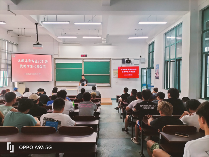 会议第三项议程,休闲体育专业2021级优秀学生代表黄许扬发言,他从自身经历出发,系统分享了自己的实习经验、专业学习以及考编经验,鼓励学弟学妹坚定奋斗目标,持之以恒努力,吃透专业知识,增强自身本领,不怕困难,树立自信,并指出学校和学院永远是大家的坚强后盾和温暖港湾。