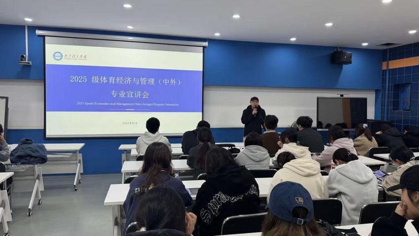 2025年10月15日,为帮助2025级新生深入了解专业特色、明确学业规划与发展路径,体育产业与休闲学院体育经济管理系在中美多功能厅举办了“2025级体育经济与管理(中外)专业宣讲会”。体育经济与管理系主任张建明、副主任王杉、副主任孙绪芹、中外合作项目专职秘书杨林、美国罗克福德大学驻华代表及学业导师王婷以及体育经济管理(中外)2025级全体学生出席本次活动,师生一起面对面交流,以2025版人才培养方案为蓝本,共话专业未来。