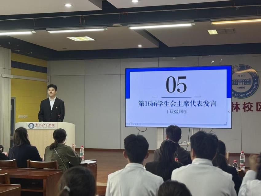 作为新一届学生会主席团代表,丁晨煜上台分享未来工作规划与展望。围绕新学年工作,他提出四点行动共识:一是要倾听并回应,主动走进同学生活;二是和学校发展同行,紧密围绕学院中心工作;三是做务实创新,将其融入活动策划;四是做团结奋进的集体,让学生会成为有温度、有战斗力的卓越集体。