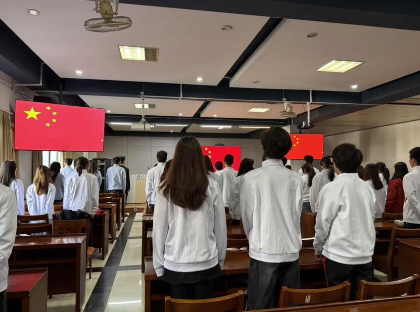 会议伊始,全体成员起立,面向国旗肃立,伴随激昂的《义勇军进行曲》奏唱国歌。嘹亮的歌声回荡在会场,不仅展现了学院学子的爱国情怀与精神风貌,更以庄重的仪式感为本次见面会奠定了严肃、奋进的基调。