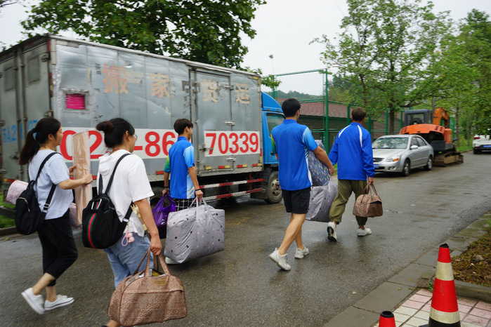 工作人员帮助学生与家长搬行李并送回宿舍