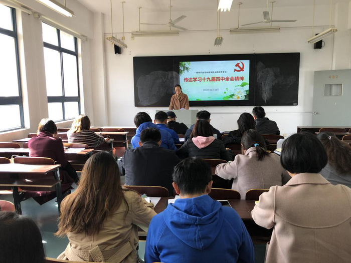 2019年11月19日下午,体育产业与休闲学院在仙林教学楼402教室召开专题会议,传达学习党的十九届四中全会精神及《江苏省高校教师师德失范行为处理办法》,体育产业与休闲学院各系正副主任及全体老师参加学习。
